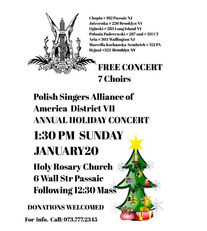 W niedzielę 20 stycznia będziemy mieli niepowtarzalną możliwość wysłuchania aż siedmiu chórów Okręgu Siódmego ZŚPA! Wystąpią z koncertem kolęd w Holy Rosary Church w Passaic, NJ. Koncert jest darmowy, ale rzecz jasna mile widziane będą wszelkie donacje, które pomogą chórom dalej krzewić nasze polskie dziedzictwo!