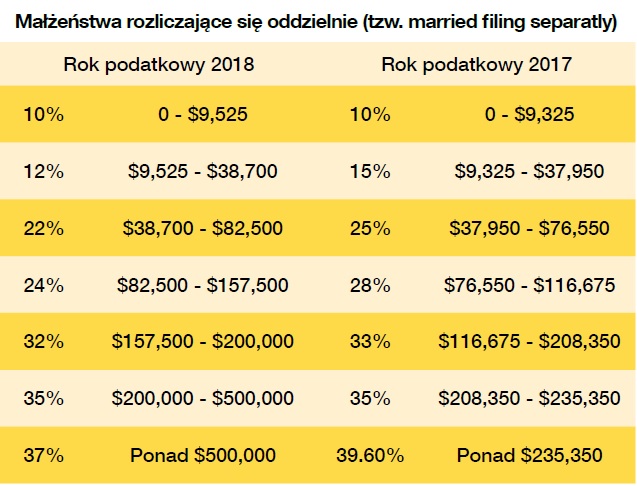 Straciliśmy również tzw. „job expenses”, czyli koszty związane z wykonywaniem naszej pracy. Musimy się pożegnać z odliczaniem kosztów związanych z jazdą samochodem, taksówką, a nawet autobusem w godzinach pracy w ramach wykonywania obowiązków służbowych. Parkingi, bramki na autostradach, dojazdy do pracy, bilety na pociąg, autobus też należą już niestety do przeszłości. Nie możemy odliczać sobie kosztów za kursy dokształcające, szkolenia, seminaria i podnoszenie swoich kwalifikacji zawodowych, ani zakupu odzieży i obuwia potrzebnego do wykonywania naszych obowiązków. Wielu moich klientów korzystało z tego rodzaju odpisów, mając po kilka ładnych tysięcy w rachunkach związanych z pracą, gdzie pracodawca nie zwracał im tych kosztów. Zmiana ta na pewno nie jest korzystna dla bardzo wielu podatników. Zlikwidowano odliczanie składek odprowadzanych do związków zawodowych, opłat za wykonanie rozliczenia podatkowego czy też koszty poszukiwania nowej pracy. Podsumowując, odpisy szczegółowe są nadal dozwolone w ramach niedawno zmienionego kodu podatkowego w Stanach Zjednoczonych. Ale jak widać, zostało ich niewiele, a niektóre z tych, co zostały, takie jak wydatki medyczne i odliczenia SALT (podatki stanowe i lokalne) - są dość ograniczone. Mimo podwojonej sumy standardowych odliczeń, odpisy nie są tak korzystne, jak były w latach ubiegłych przy wyszczególnionych odliczeniach. Odczujemy tę zmianę dość mocno w tym roku, nie mogąc sobie odpisać większości wydatków. Aby wyszczególnianie odpisów było korzystne dla Państwa, potrzebujecie pewnej kombinacji tych odliczeń, aby przekroczyć standardowe odliczenie. Łatwo zrozumieć, dlaczego większość podatników nie będzie w stanie wyszczególniać swoich odpisów w przyszłości. Po prostu nie będą w stanie zebrać wystarczająco dużo swoich kwalifikujących się według nowej reformy odpisów do odliczenia. Dla przykładu podam, para moich znajomych tradycyjnie wyszczególniali swoje odpisy. Jednak w 2018 roku będą mieli około $9000 w odliczeniu odsetek od kredytu hipotecznego, kilka tysięcy dolarów w datkach na cele charytatywne oraz około $6000 w podatkach państwowych i lokalnych, w tym podatki od nieruchomości. W poprzednich latach to uczyniłoby sporą wartość wartą skorzystania z wyszczególniania odpisów plus po $4000 na osobę personalnych odpisów, ale wygląda na to, że będą oni używać standardowego odliczenia w wysokości $24,000 przy rozliczaniu się w tym roku. W latach ubiegłych małżeństwom posiadającym pożyczkę hipoteczną i opłacającym podatki za nieruchomość nie było trudno zebrać wydatki powyżej $12,000-$13,000 przekraczające standard deductions i skorzystać z wyszczególnionych odpisów. Biorąc pod uwagę limit podatków za ziemię w wysokości do $10,000, w tym roku zebranie sumy powyżej $24,000 (tyle wynosi standardowy odpis na małżeństwo w 2018 roku) praktycznie jest niemożliwe, chyba że mamy bardzo wysoko oprocentowaną pożyczkę, bądź też masę rachunków medycznych. Ale ani jednego, ani drugiego Państwu nie życzę.