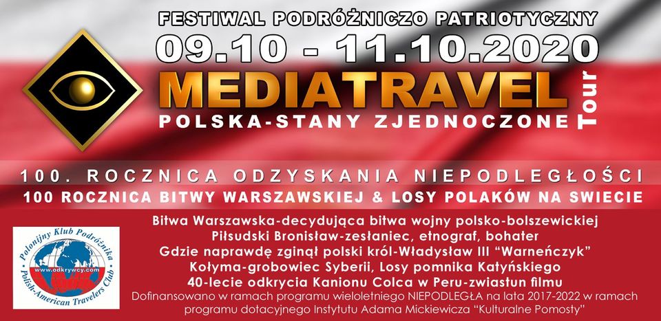 Po raz drugi Polonijny Klub Podróżnika i Fundacja Arkadia z Polski organizują Festiwal Mediatravel, który odbędzie się w dniach pod 9, 10 i 11 października 2020 roku.