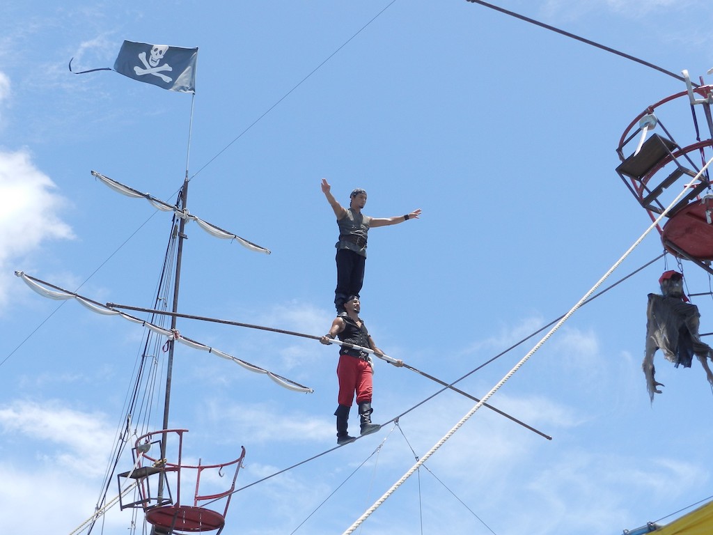 Dodatkowo bawiąc się na jarmarku w każdym momencie możecie zatrzymać się by podziwiać niezwykłe akrobacje Piratów z Karaibów!! Niezwykłe show przedstawiające pełną mrożących krew w żyłach scen piracką potyczkę będzie odbywało się wśród podwieszonych na wysokości 30 stóp rei i lin olbrzymiego statku.
